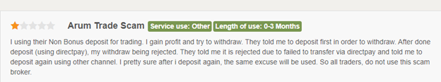 There are people who’ve lost money trading with Arum Trade. Here’s what one posted in Trustpilot:
